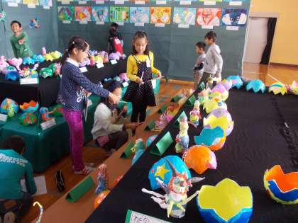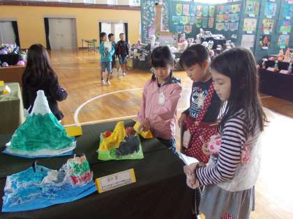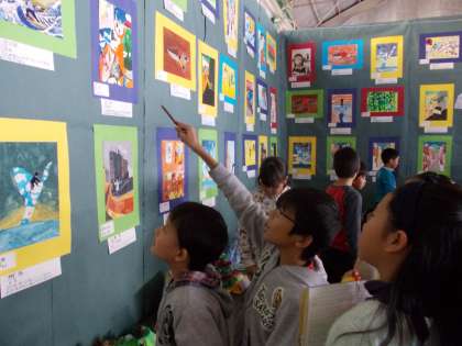 展覧会児童鑑賞日 11月13日(木) 3年生 公開日 2014/11/13 更新日 2014/11/13 3年 展覧会の会場準備が整い、他の学年の作品の鑑賞会を行いました。 1年生から6年生までの作品を見ながら、「この作品すごいね。」「すごく苦労して書いたんだろうね。」「こんなに細かく作ってあるよ。」など、仲間のがんばりをしっかりと見つけることができました。