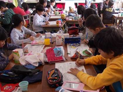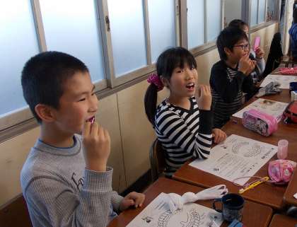 歯について学習しました! 【11月19日(水)の4年生】 公開日 2014/11/19 更新日 2014/11/19 4年 今日の総合の学習では、歯科医の先生をお招きして歯肉炎のお話をお聞きしました。その後、教室にもどって磨き残しを染め出し、歯磨きをしました。自分の歯磨きの不十分なところをよく知って、磨くことが大切ですね。