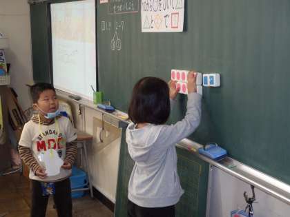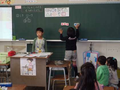 研究授業を行いました 1年生 算数 【11月21日(金)】 公開日 2014/11/21 更新日 2014/11/21 1年 算数の授業で研究授業を行いました。 くり下がりのある引き算を学習しました。 全員が計算の仕方をクラスのみんなに説明することができました。 友達に一生懸命伝えようとがんばる姿がとても印象的でした。