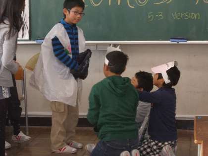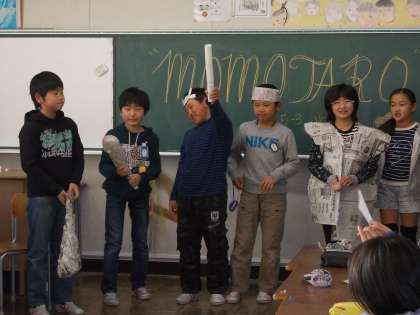 オリジナル桃太郎劇をしたよ その3 【1月20日(火)の5年生】 公開日 2015/01/20 更新日 2015/01/20 5年 2学期から練習をしてきた英語劇「MOMOTARO]。せりふを暗記し、みんなで動きを考え、それぞれのグループごとに少しずつちがった出来上がりでした。どのグループも英語の先生にほめていただき、大成功でした。