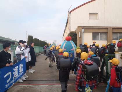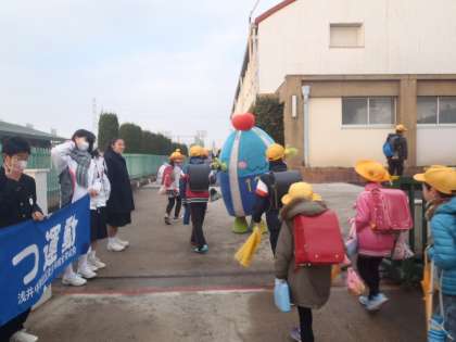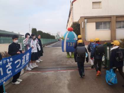 あいさつ運動 今日も「いちみん」登場 【1月20日(火)】 公開日 2015/01/20 更新日 2015/01/20 学校生活 今日も「いちみん」が朝、校門に登場してくれました。 いちみんとハイタッチをする子や握手をする子などがたくさんいました。 いちみんはしゃべれませんが、浅井中小の子は、毎日元気にあいさつをしてくださいね。