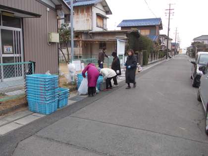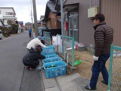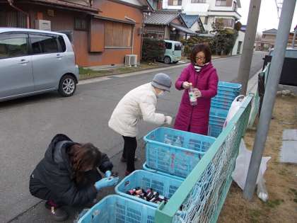 いつものように公民館の前で行われています。見たこともないような大きなビンがあり大変驚きました。