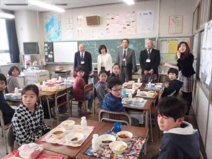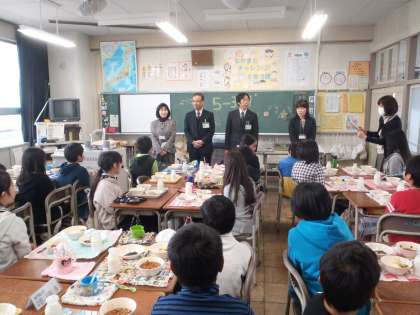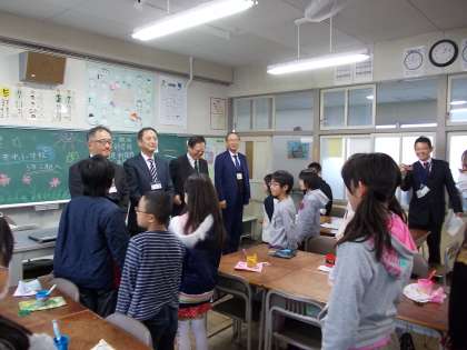 給食交歓会 5年生 その1 【1月26日(月)】 公開日 2015/01/26 更新日 2015/01/26 5年 今日の5年生は大活躍。 朝は全校の前ですばらしい合唱を披露しました。 そして、お昼は、副市長さんや教育長さんなどをお迎えして、給食交歓会がありました。 まずは、あいさつをして、来賓の方を迎えました。