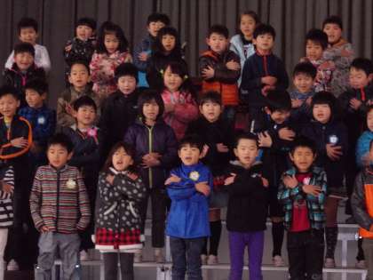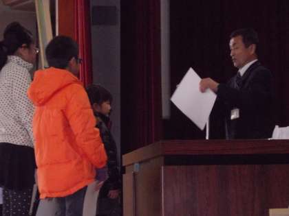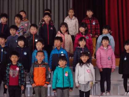 1年生がんばりました! 【2月16日(月)の1年生】 公開日 2015/02/16 更新日 2015/02/16 1年 朝の集会で、1年生は、群読発表をしました。冬休みから練習してきた群読です。動作もつけて発表しました。『ゆっくり、はっきり、大きな声で、気持ちを込めて、笑顔で』と、堂々とした発表でした。 また、表彰伝達がありました。代表として名前を呼ばれると、とても元気な返事ができました。
