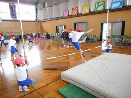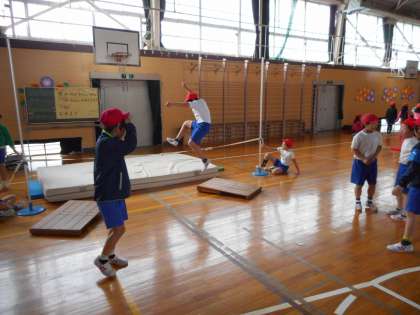 高跳び楽しいな! 3月11日(水) 3年生 公開日 2015/03/11 更新日 2015/03/11 3年 3年生体育の最後の種目は「高跳び」です。 初めてなので、ゴムと踏み切り板を使って挟み跳びの練習をしました。 最後に記録会をすると、110cmを跳ぶ子もいて、みんなから歓声が上がりました。