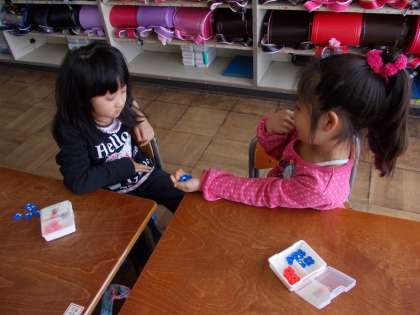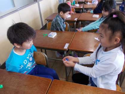 ペアになって学習しました。 【4月21日(火)の1年生】 公開日 2015/04/21 更新日 2015/04/21 1年 算数は、おはじきを使って学習をしました。4または、5個のおはじきを両手に分けて、「数当てあそび」をしました。