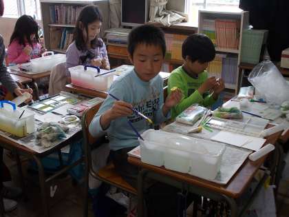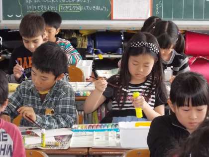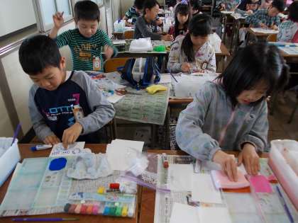 ぺた、ぺた、ぺた 【4月22日(水)の4年生】 公開日 2015/04/22 更新日 2015/04/22 4年 図工で「すてきなペーパーショップ」をしました。 画用紙に用意してきた材料でスタンプをして、 いろいろな模様を作りました。 れんこん、じゃがいも、大根、 段ボールを丸めて形を作ってくるなど スタンプの材料も様々。 すてきな模様のペーパーができました。