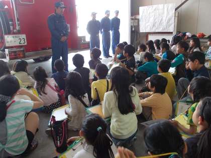 消防署へ行ったよ その1【4月24日(金)の4年生】 公開日 2015/04/24 更新日 2015/04/24 4年 今日は浅井消防出張所の見学へ行きました。消防署の中や消防車を見せていただき、その説明を消防士さんからしていただきました。見学を終えた後は、たくさんの質問に答えていただきました。たくさんのことを学習できました。社会の授業でまとめていきます。