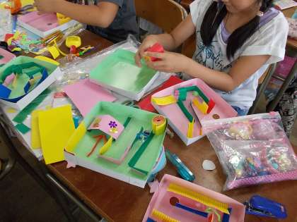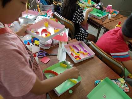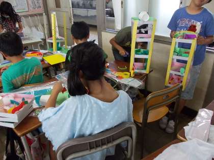 4年生の図工では、ビー玉を転がして楽しく遊べる立体迷路を作成していました。材料を工夫して、おもしろい転がり方をする仕組みを考えていました。工夫をこらした迷路が多く、ゴールへたどりつくのが大変な作品もありました。