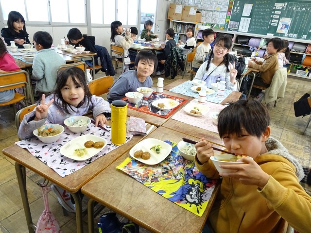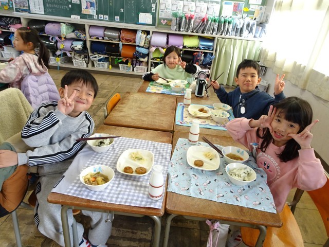 今日も、笑顔いっぱいの給食の時間。みんなでおいしくいただきました。