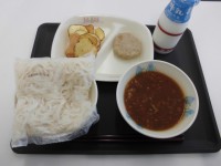 ちゃんこ汁は、ちゃんこ鍋のように、具材がたっぷり入った汁ものです。今日は、鶏団子、焼き豆腐、にんじん、はくさい、だいこん、えのきたけ、ねぎ、しいたけを使った汁ものです。