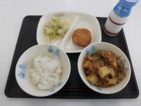 今日の献立は、ごはん、牛乳、とり肉の竜田揚げ、こがね和え、じゃがいものすり流しです。