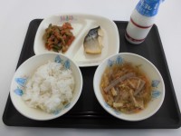今日の献立は、ごはん、牛乳、いわしの梅煮、いんげんのごまささみ和え、オクラのみそ汁です。
