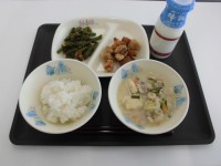 今日の献立は、ごはん、牛乳、肉じゃが、ふんわり野菜揚げ、こまつなのなめたけ和えです。