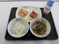 今日の献立は、ごはん、牛乳、絹厚揚げの肉みそがけ、こまつなのおひたし、みぞれ汁...