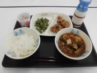 今日の献立は、ごはん、牛乳、絹厚揚げのそぼろあんかけ、鉄火みそ、湯葉のすまし汁...