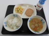 今日の献立は、ごはん、牛乳、ポテトコロッケ、こまつなのささみ和え、豆乳入りみそ汁...