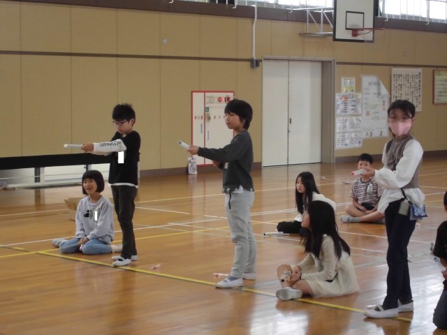 「とじこめた空気や水」の学習をしています。屋内運動場で、空気でっぽうを使い、玉を飛ばしていました。どんなことに気がつくことができたでしょうか。