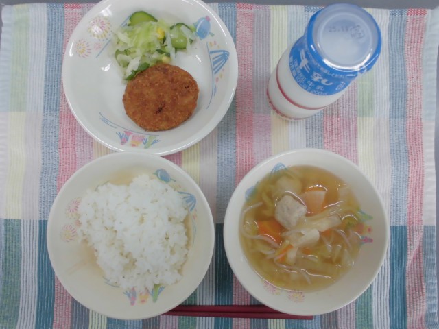 ご飯 牛乳 ミンチカツ 塩だれサラダ とり団子汁