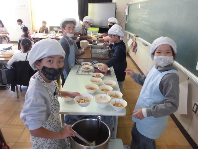 給食の準備、配膳をしている様子です。テキパキと動いています。