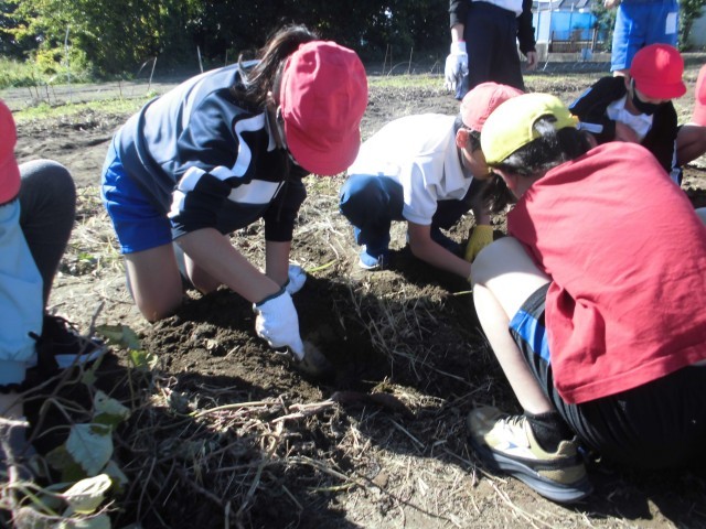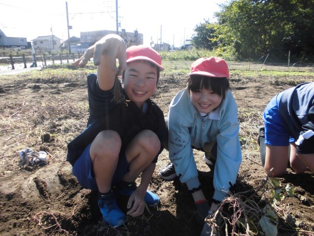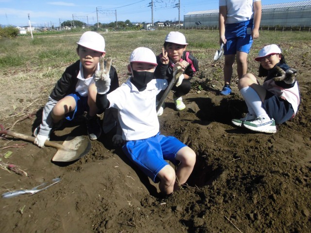 なかなか芋が見つからなくても、友達と「こっち掘ってみよう」「もう少し深く掘ろう」と声をかけ合い、力を合わせて頑張る姿は立派でした。