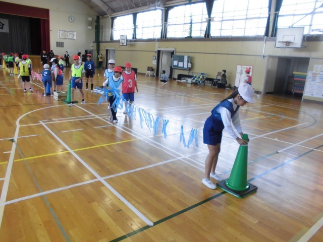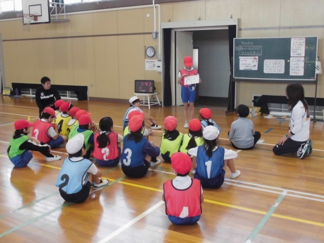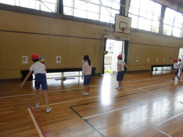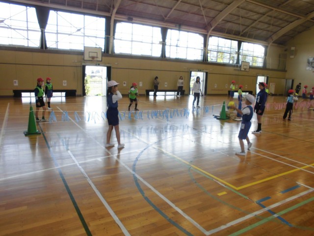 最初に一人一人がボールをついたり的当てをしたりして、個人のレベルアップを図ったあと