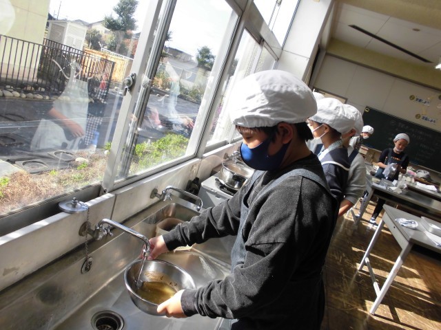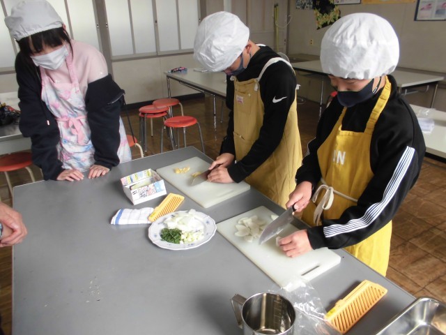 みそ汁づくりは、煮干しから出汁をとるところからスタートしました。今回の具材は大根、油揚げ、ネギです。真剣な表情で安全に気をつけながら調理を進めました。