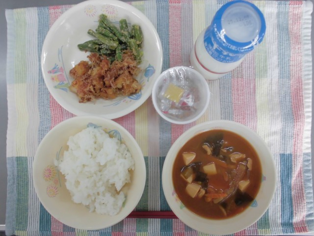 ご飯 牛乳 たらのおかか揚げ いんげんのごま和え 豚汁 納豆
