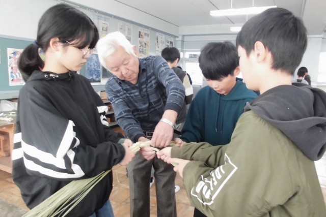 3人1組となり、協力しながら藁を編んでいきました。緩まないように編んでいくのがとても難しかったし、力が必要な作業でしたね。みんな、夢中になって取り組んでいました。