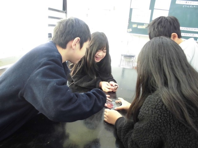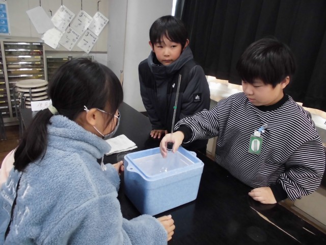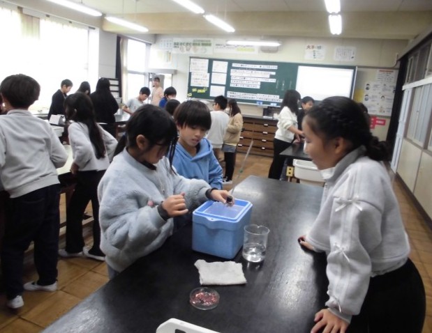理科では、温度による空気の体積の変化を調べる実験をしていました。それぞれのグループごとで実験を行い、ゼリーの動きに驚きの声をあげている子がいました。