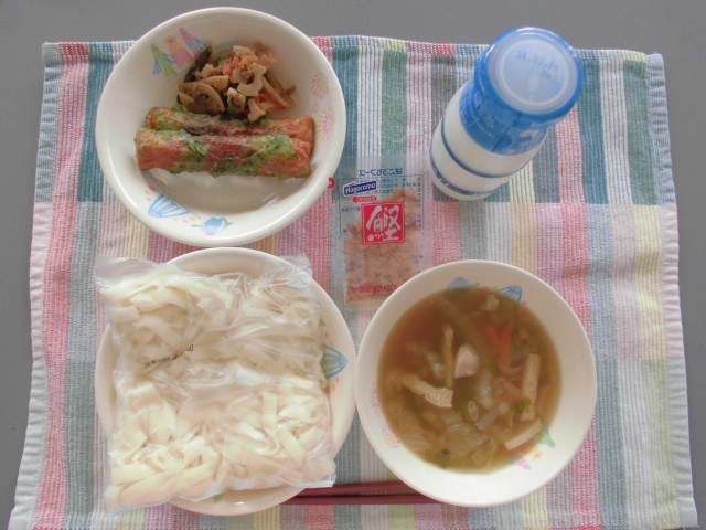 五目きしめん 牛乳 ちくわの米粉磯部揚げ きんぴられんこん