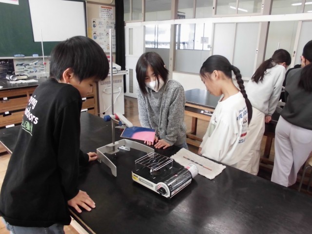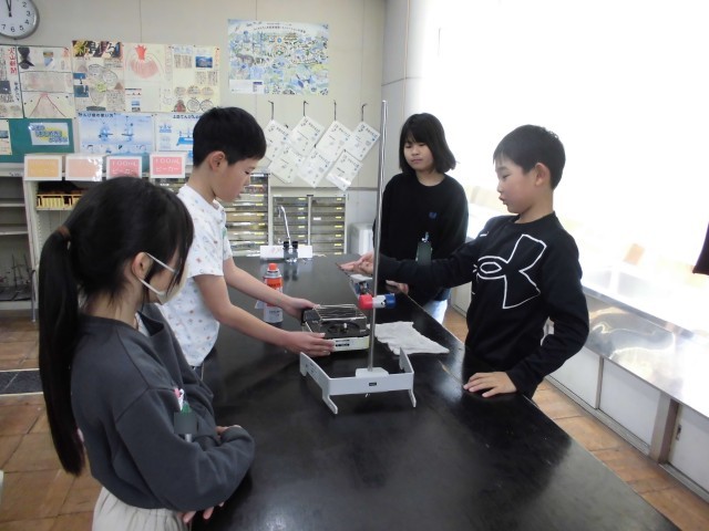 理科では、「もののあたたまり方」の学習に取り組んでいます。今日は、金属の棒や板を熱して、あたたまり方を調べる実験を行いました。子どもたちは、「示温シール」の色の変化のしかたを観察しました。火を使う実験のため、安全に気をつけて取り組むことができました。
