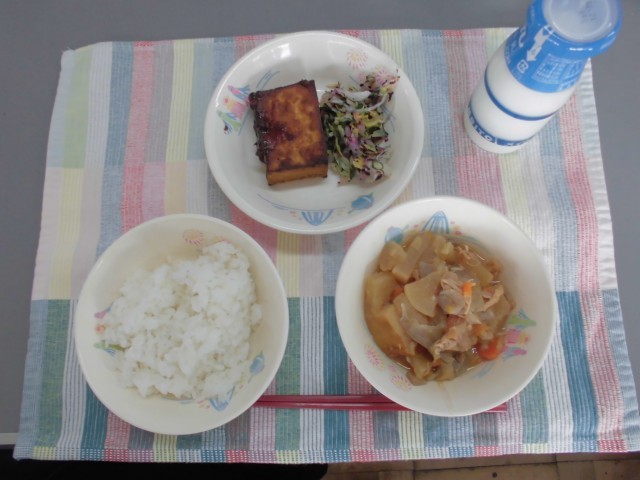 ご飯 牛乳 関東煮 絹厚揚げの肉みそがけ 赤じそ和え
