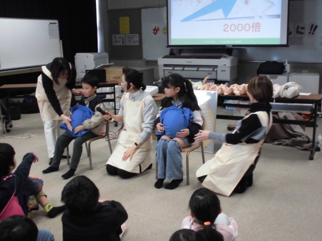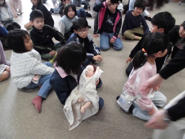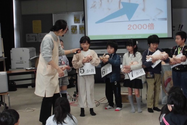 代表児童の心音と赤ちゃんの心音の速さを聞き比べたり、胎児の人形を抱っこさせていただいたり、