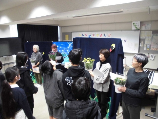 今日は読み聞かせボランティアの方に6年生に向けて読み聞かせをしていただきました。ブラックライトで光る蛍光塗料の紙芝居で、暗闇で光るめずらしい絵に、子どもたちの目も輝いていました。これまで「クローバー」のみなさんには、6年生だけでなく、低学年から高学年まで、心が温かくなるお話を読み聞かせしていただきました。皆さんのおかげで本を大好きになる子どもたちもたくさんいました。子どもたちも「感謝の気持ちを伝えたい」という思いから、今日は、学校を代表して「クローバー」のみなさんに6年生から感謝の言葉を伝え、手紙と花束をお渡しすることができました。これまで本当にありがとうございました。これからもまた、よろしくお願いします!