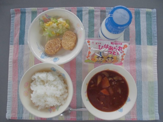 ご飯 牛乳 ハヤシシチュー チキンナゲット コールスロー ひなあられ