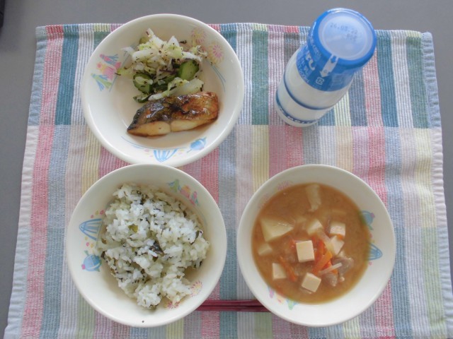 わかめご飯 牛乳 さわらの照り焼き 春キャベツのしそ和え 呉汁 清美オレンジ