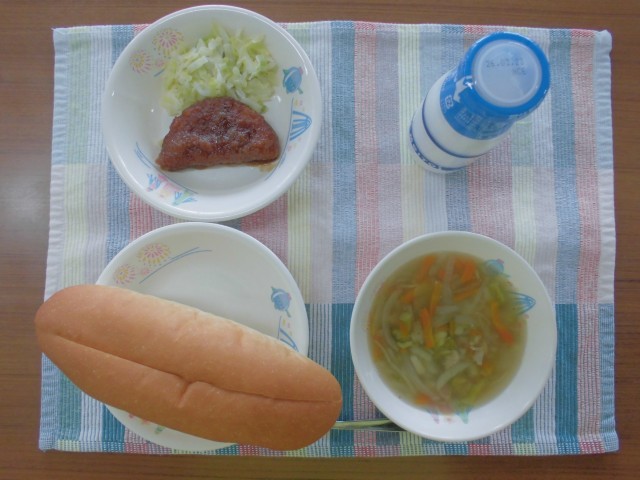 サンドイッチロールパン 牛乳 ハムカツサンドの具 キャベツのドレッシング和え コンソメスープ