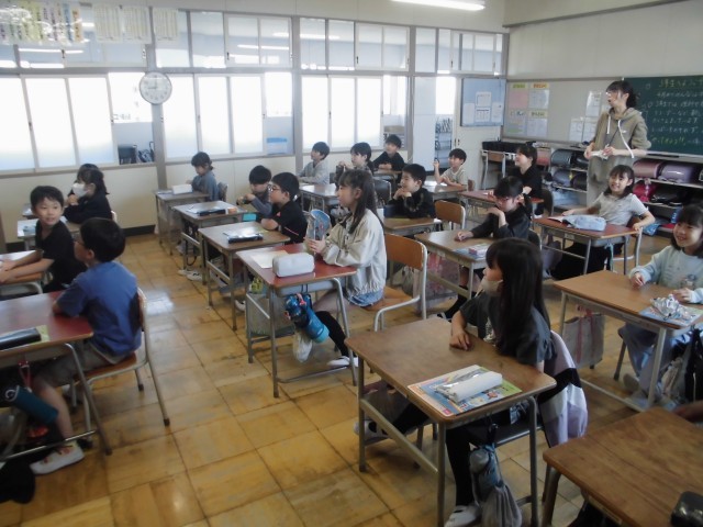 初めて会うALT(外国語指導助手)の先生に、子どもたちは興味津々!最初は少し緊張している様子もありましたが、先生の明るい自己紹介や楽しいゲームを通して、教室はすぐに笑顔でいっぱいになりました。