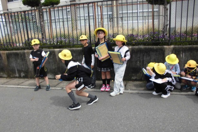 方位の勉強とともに、学校のまわりの様子を観察しました。