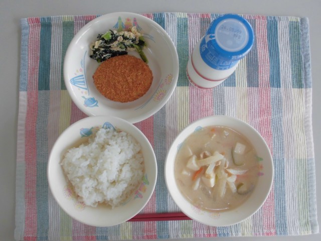 ご飯 牛乳 ポテトコロッケ こまつなのささみ和え 豆乳入りみそ汁