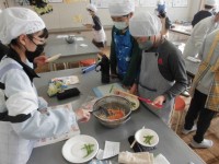 2組の児童が、「家族が喜ぶ献立」を考えて調理しました。パスタ、オムレツ、焼きそば、チャーハン、ポテトサラダ、野菜のベーコン巻きなどいろいろなメニューが登場しました。オレンジとオリーブオイルでドレッシングを作ったり、ごま油で炒めたりと味付けの工夫もたくさん見られました。
