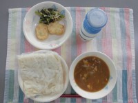 今日の給食は、ごはん、牛乳、BBカレー、フルーツのミルクゼリーあえです。