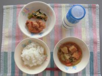 今日の給食は、ごはん、牛乳、中華スープ、野菜どえりゃー・うー・まー・ぼうです。