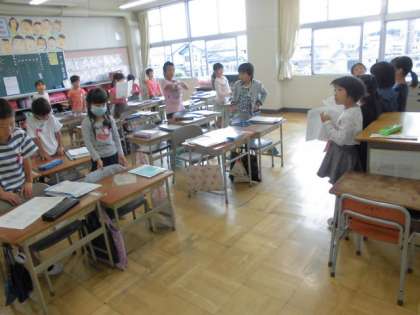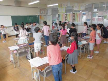 1年生が、自分たちだけの力で朝の活動です。係の号令に従って、詩の暗唱が元気よく行われています。立派に成長しましたね。素晴らしいです。
