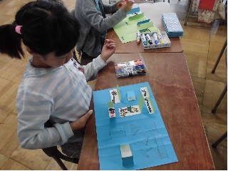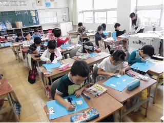 図工「まどをひらいて」は、カッターナイフを使って、窓を作り、楽しい家を作っています。今日は、窓から見える物をいろいろ工夫して描きました。動物がいたり自分がいたりお花畑があったりいろいろ工夫して楽しい家ができてきました。あと少しで完成です。楽しみですね。