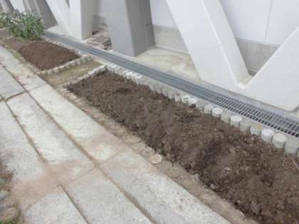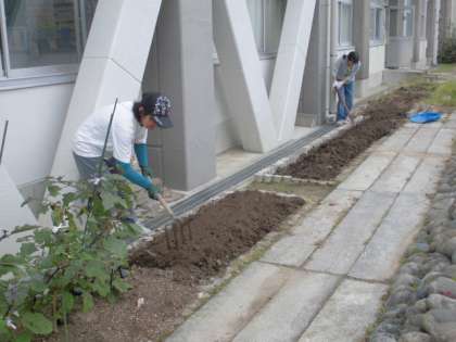 今にも雨粒が落ちてきそうな曇り空の中、緑化ボランティアの方々が活動をしていました。北舎南側に、野菜などを植えるために土を耕していました。どんな野菜を作るのでしょうか?
