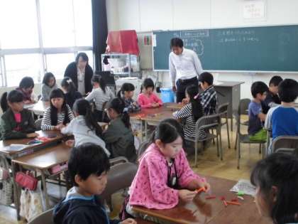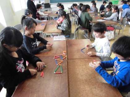 3年1組は、算数で三角形の学習です。三角形の特長を学習した後、ストローとモールを使って三角形を作っていきました。
