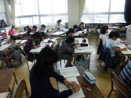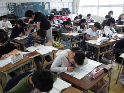 5年1組は、算数で分母の違う分数の計算問題を教科書を使ってたくさん解いています。