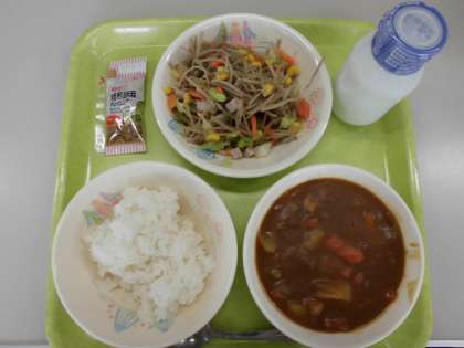 今日の給食は、ごはん、牛乳、ポークカレー、ごぼうサラダ(ごまドレッシング)です。